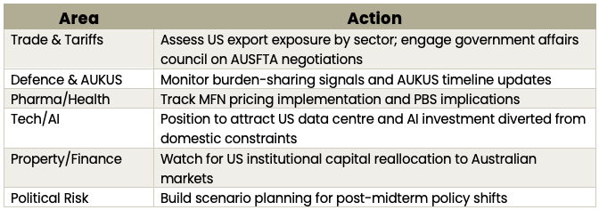 - For Australian clients, the immediate priority is tariffs — with a new 15% global levy already in effect — but the broader implications across defence, pharma, AI and investment are equally significant.
